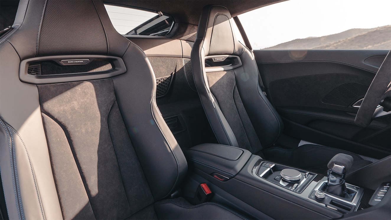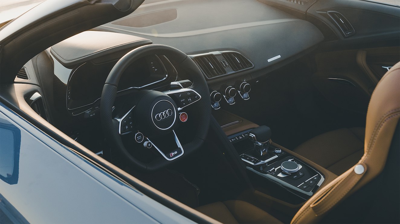 Être sportive pour l’Audi R8 signifie aussi faire dans le luxe et le confort pour l’intérieur. Son habitacle profite d’un design épuré, lequel se complète parfaitement avec le poste de conduite ergonomique et intuitif. Esthétiques, les sièges offrent un confort d’assise élevé. Pour une aisance optimisée à bord de cette Audi taillée pour la course, on peut opter entre les sièges baquet avec garniture de dossier en carbone mat ou en cuir Nappa fin noir Audi exclusive. La sellerie raffinée, mixte ou en cuir, augmente le ressenti de raffinement à l’intérieur. Le volant, agréable au toucher, a l’avantage d’être multifonction. Le conducteur aura ainsi à sa portée tous les instruments utiles pour faciliter le trajet : carte de navigation, compteur, etc.