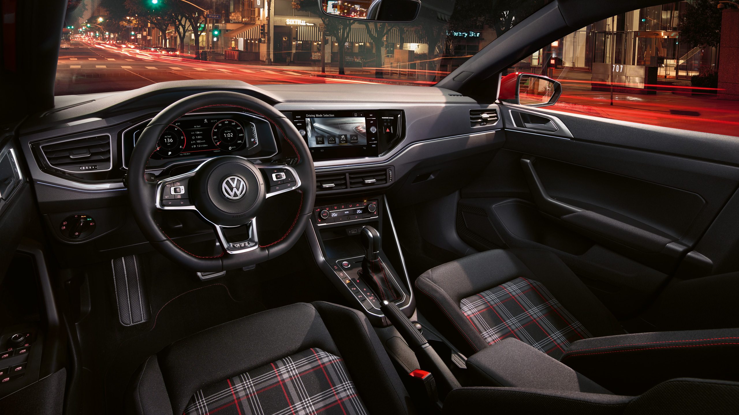 Le niveau de confort offert par la Nouvelle Polo GTI dépassera vos attentes, cela ne fait aucun doute. Prenez la main sur le système radio ‘Composition Colour’ en toute simplicité à partir du volant sport multifonction, gainé de cuir et orné de surpiqûres rouges. Retrouvez également ces détails sur le levier de vitesses et les tapis de sol. Les sièges sport ‘Clark’ couleur Titanium Black, avec leur motif à carreaux distinctif et leurs bandes rouges uniques accentuent davantage l’allure GTI. Le support lombaire, intégré de série, soulage la tension au niveau de votre dos, ce qui vous permet de maintenir une posture parfaite, même lors de longs trajets, lorsque vos muscles commencent à fatiguer. Grâce à cette caractéristique, évitez les problèmes de dos provoqués par une posture incorrecte.